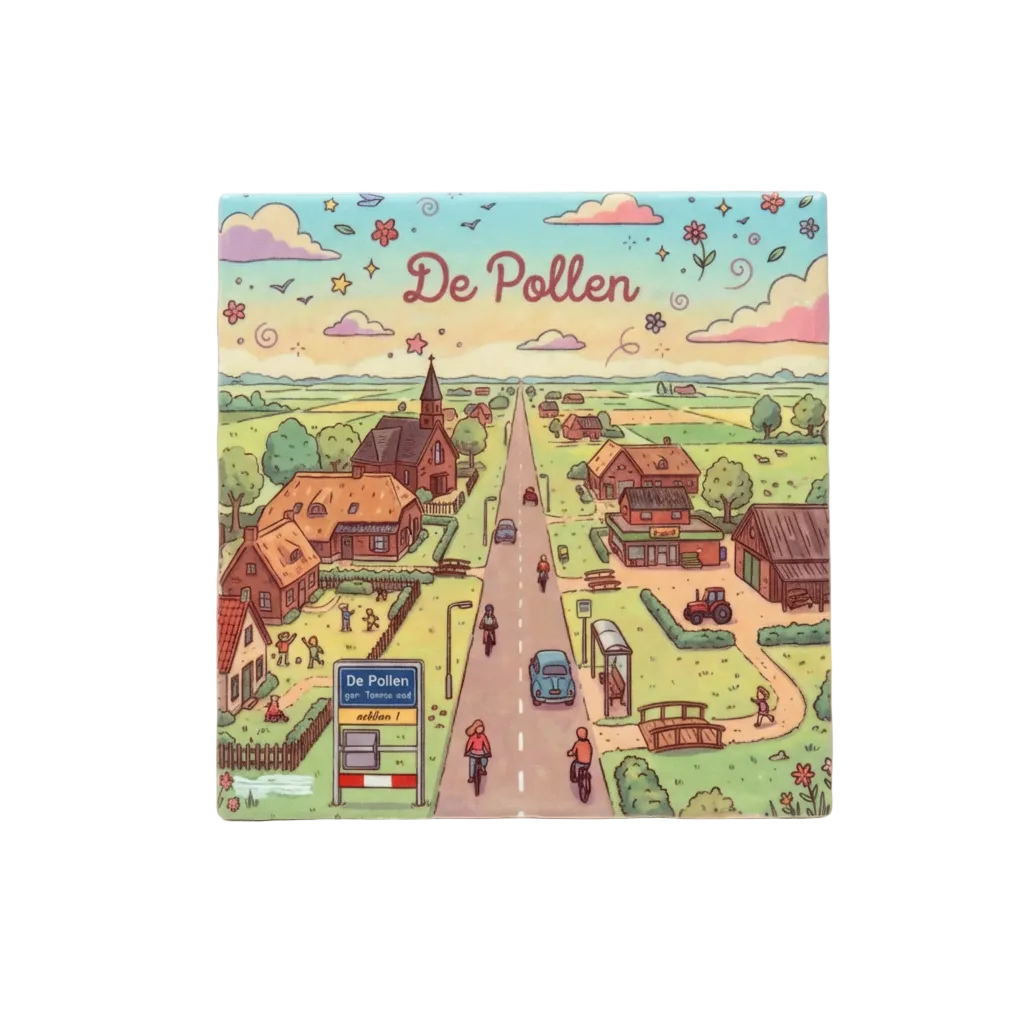 Of je er nu bent opgegroeid, er met veel plezier woont of een bijzondere band hebt met dit dorp: dit tegeltje van De Pollen brengt het karakter van de streek direct in je interieur. De vrolijke en gedetailleerde illustratie toont de weidse velden, de karakteristieke boerderijen en de herkenbare dorpskern die De Pollen zo eigen maken.