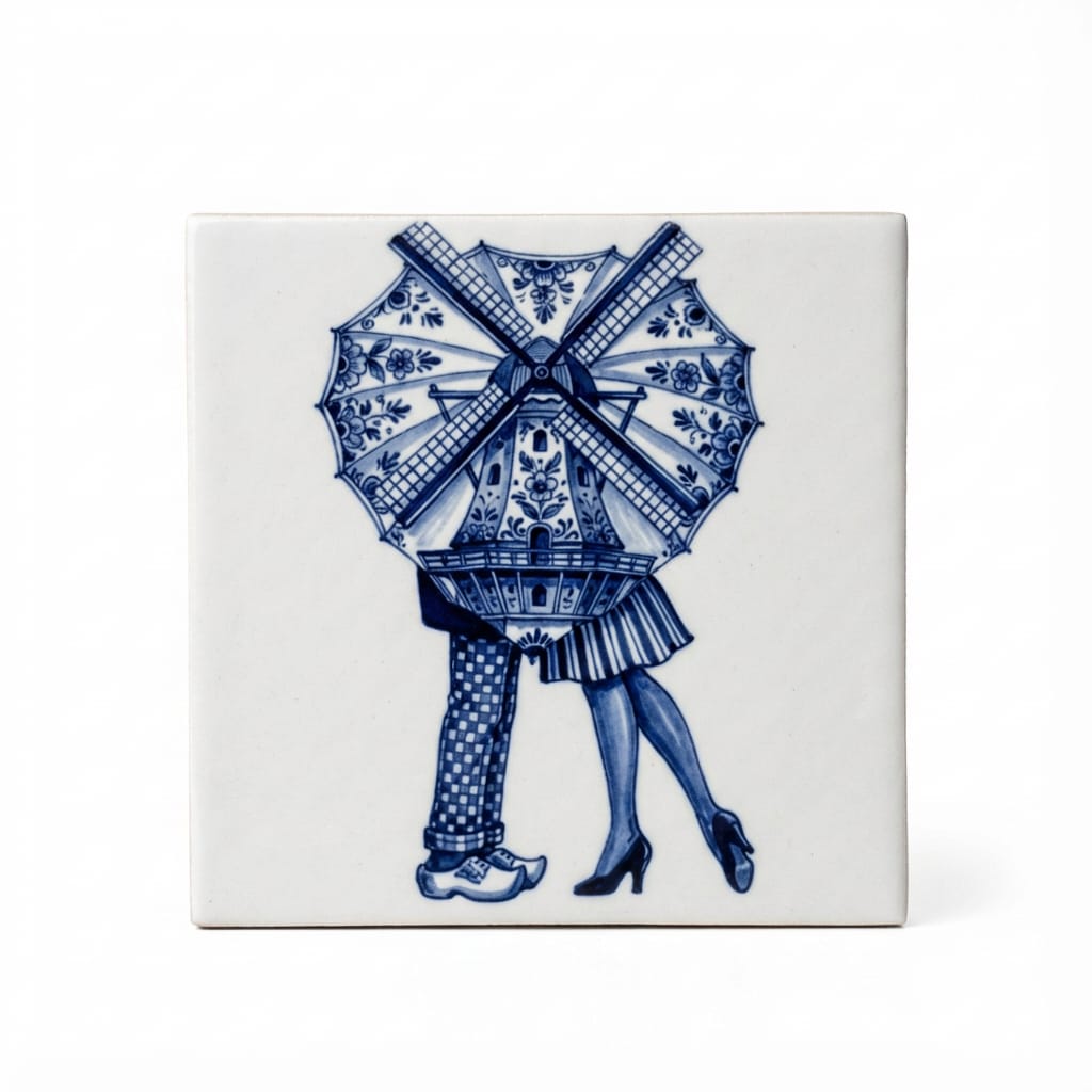 Hollands erfgoed met een moderne twist! Deze decoratieve tegel toont een charmant stel in klassieke Delfts Blauwe stijl. Perfect voor liefhebbers van Nederlandse cultuur en tijdloze elegantie.