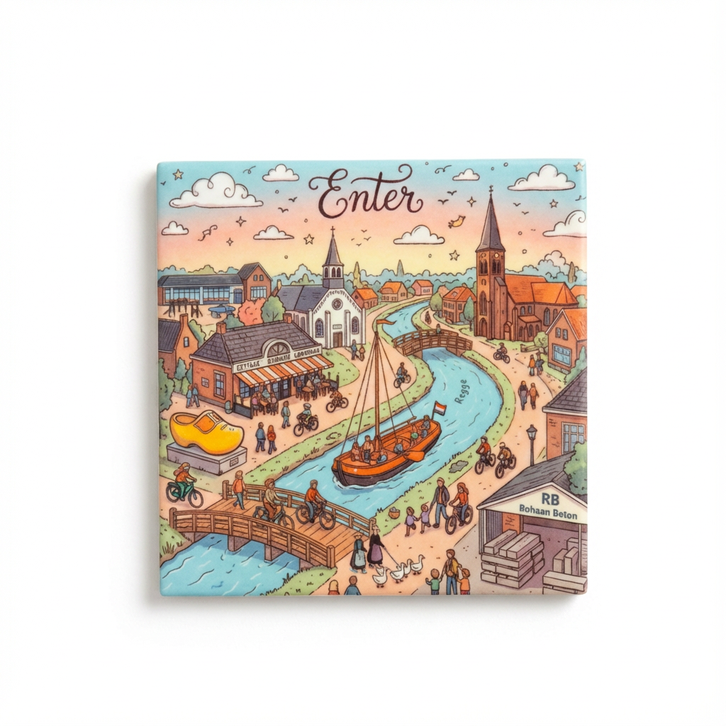 Of je nu een trotse Enternaar bent, geniet van een tochtje over de Regge of een bijzondere band hebt met dit karakteristieke dorp: dit tegeltje brengt de ziel van Enter direct in je interieur. De gedetailleerde illustratie voert je mee langs de meest iconische elementen, zoals de statige kerken, de bedrijvigheid van fietsers en wandelaars, en natuurlijk de wereldberoemde grote klomp. Het kabbelende water van de Regge met een authentieke Enterse Zomp vormt het kloppende hart van dit ontwerp, dat de perfecte balans tussen traditie en dorpsleven weerspiegelt.