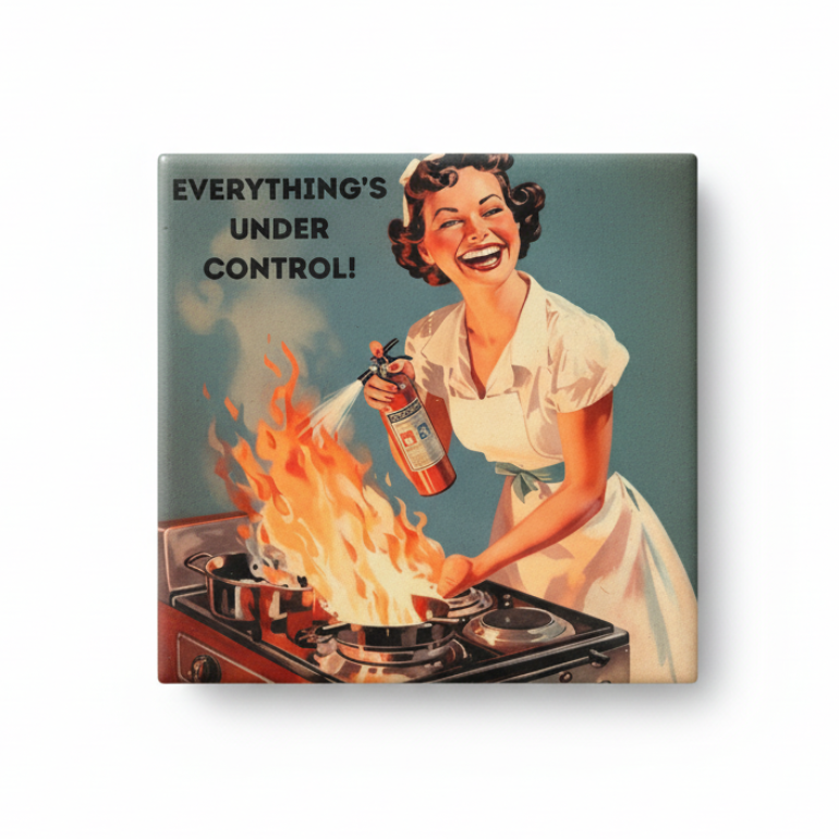 Herken je dat? Je staat uitgebreid te koken, de pannen staan op het vuur en plotseling gaat het net even anders dan gepland. Dit hilarische tegeltje met de tekst "Everything's under control!" is een ode aan iedereen die met een glimlach — en misschien een brandblusser — de chaos in de keuken de baas blijft. Met zijn prachtige vintage illustratie en sprekende kleuren brengt dit ontwerp direct karakter en een flinke dosis humor in je interieur.