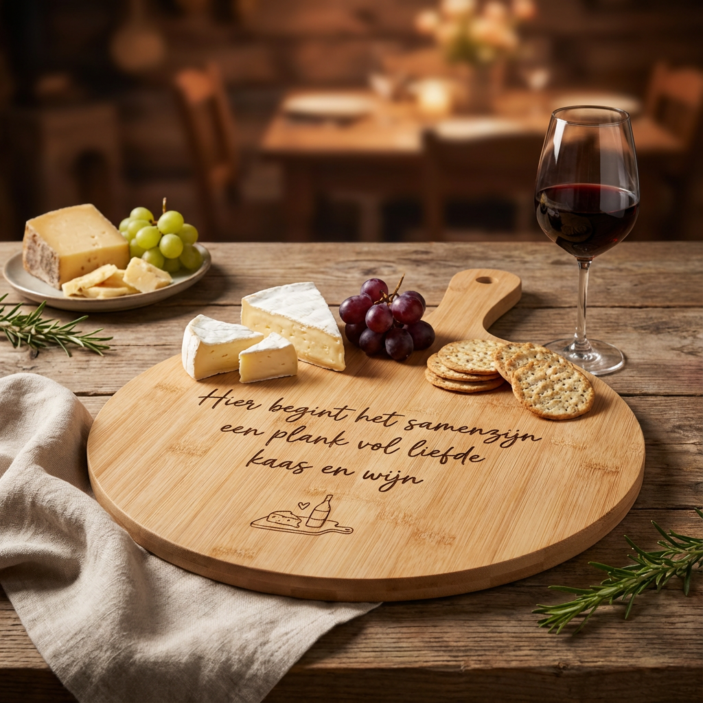 Hoogwaardige kwaliteit: De plank is stevig, duurzaam en perfect geschikt voor het serveren van je favoriete kazen, hapjes en natuurlijk een goed glas wijn.