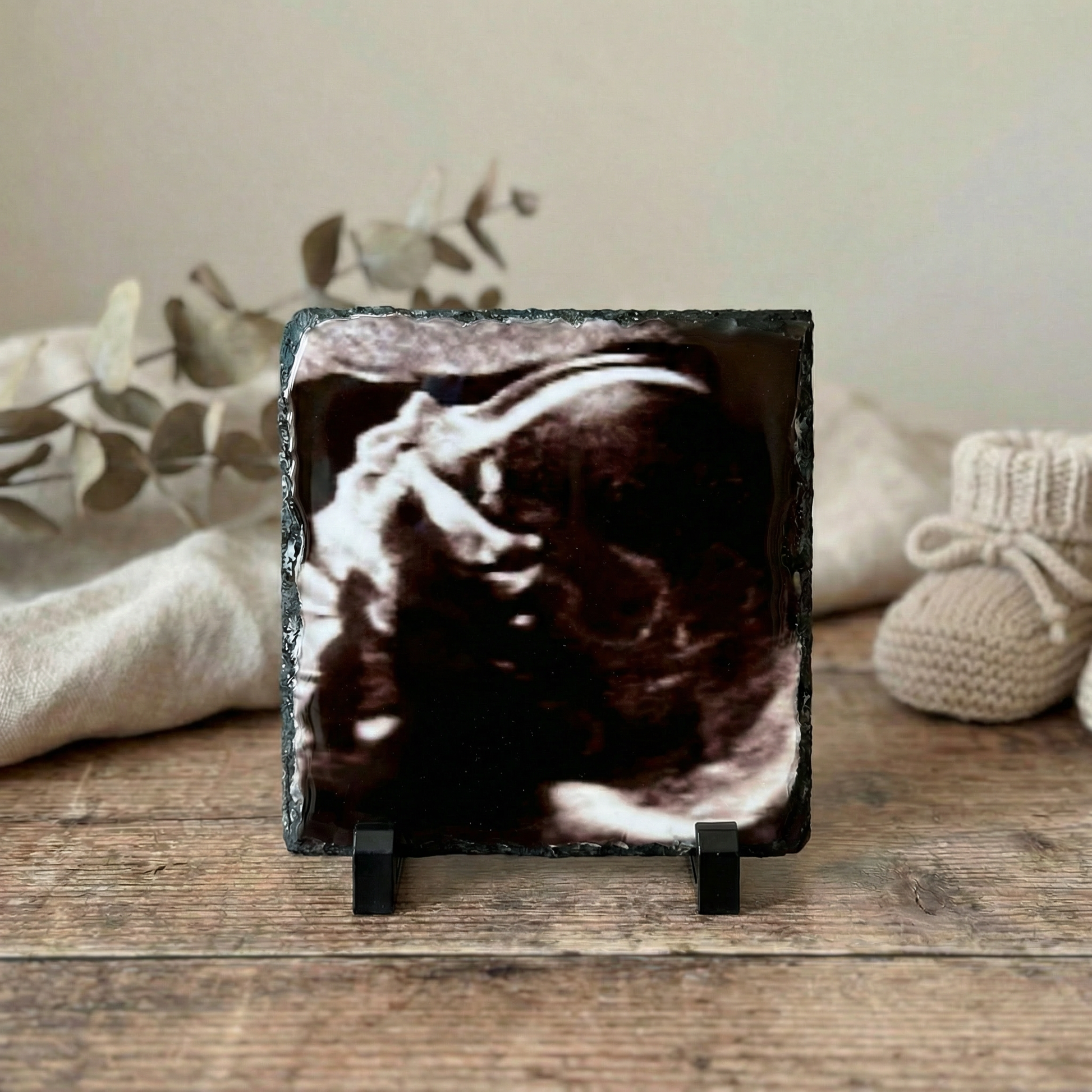 Upload je eigen echo foto en wij bedrukken deze met zorg op een hoogwaardige leisteen tegel. Perfect als cadeau voor aanstaande ouders of als blijvende herinnering aan een bijzonder moment.
