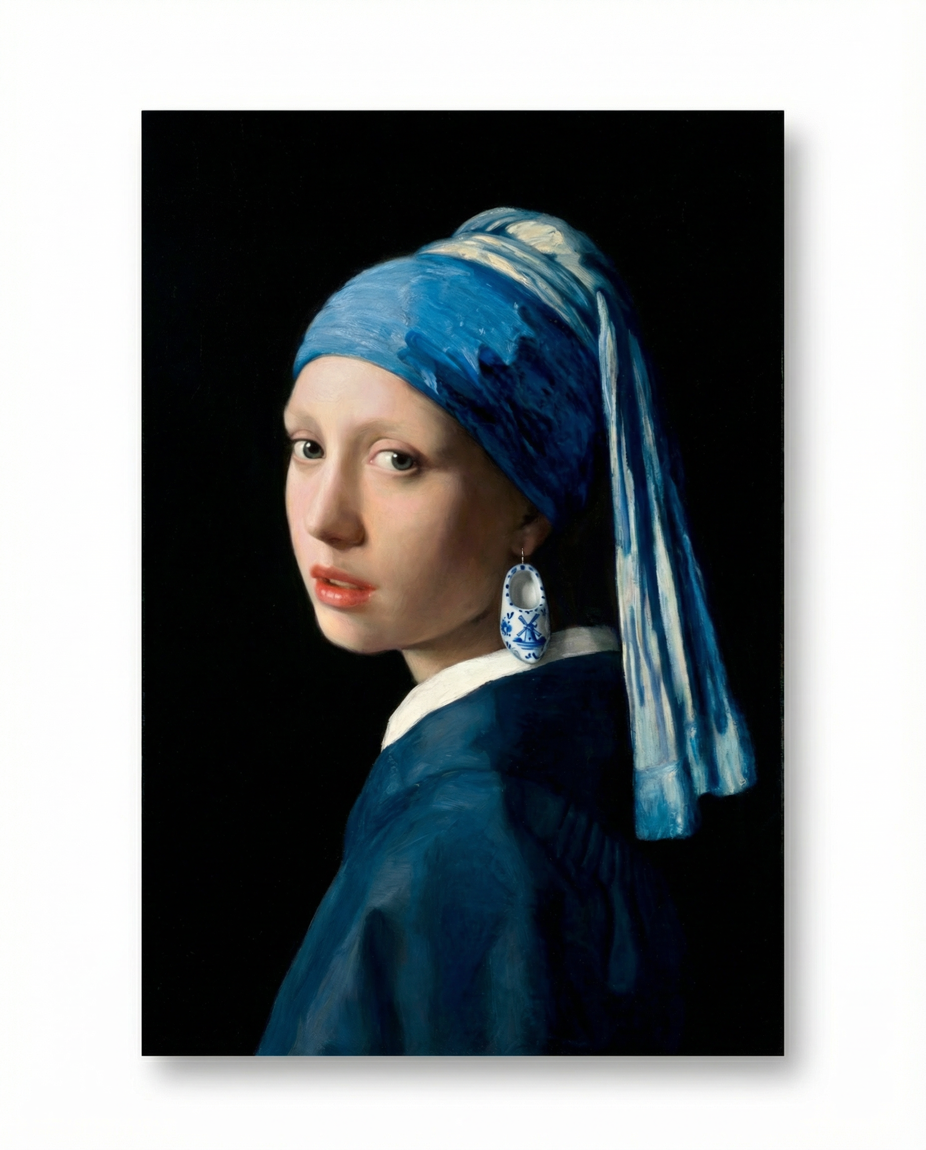 Een iconisch meesterwerk met een Nederlandse twist - het beroemde Meisje met de Parel, opnieuw geïnterpreteerd met Delfts Blauwe details. Een prachtige combinatie van klassieke kunst en Nederlandse erfgoed.