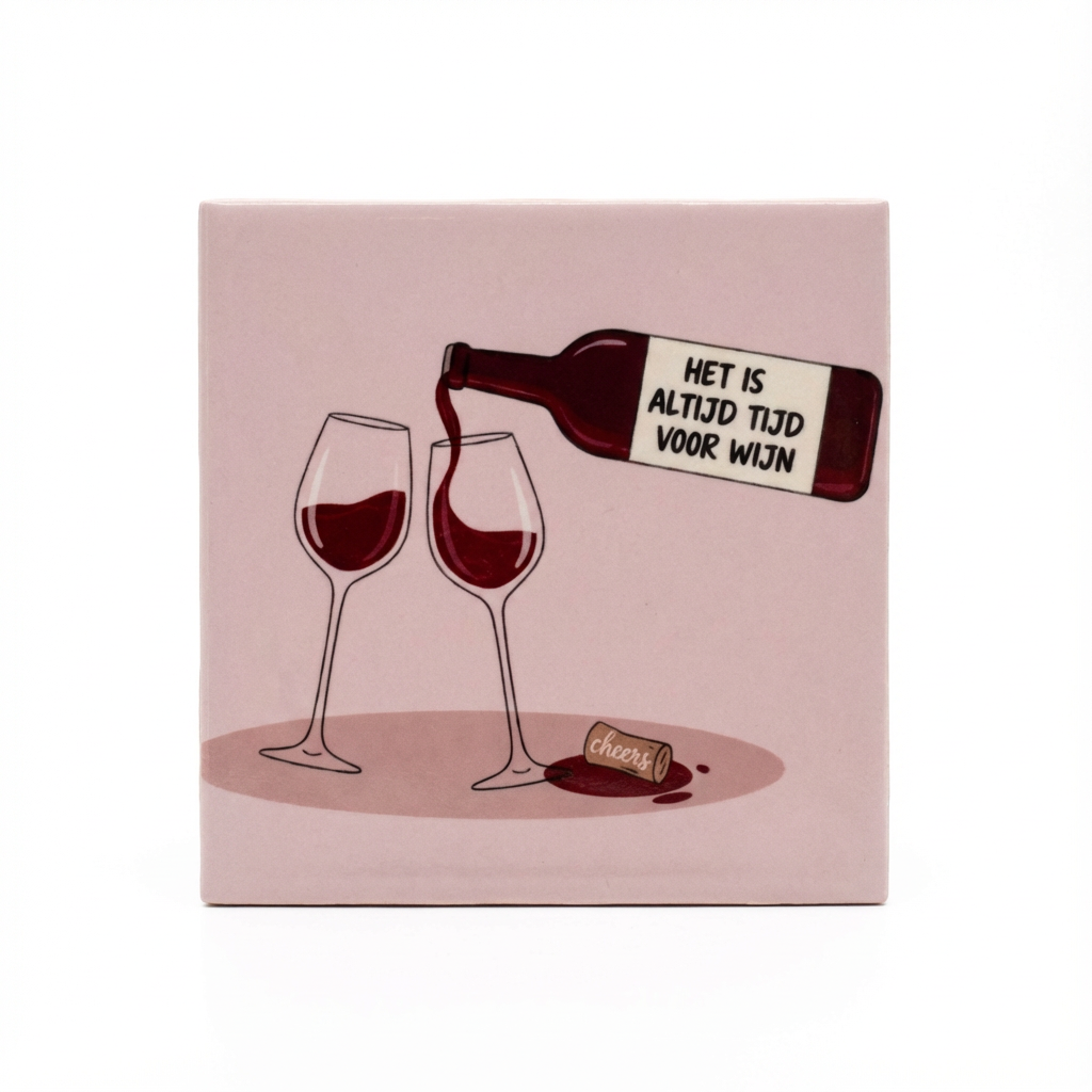 Of je nu een echte fijnproever bent, houdt van lange avonden tafelen met vrienden of gewoon vindt dat elk klein succes gevierd mag worden: dit tegeltje brengt de sfeer van het goede leven direct in je interieur. De speelse illustratie met de tekst "Het is altijd tijd voor wijn" herinnert je eraan dat er altijd wel een reden is om te proosten. Met de warme roodtinten, de sierlijke wijnglazen en de rondslingerende kurk is dit ontwerp de perfecte weerspiegeling van ontspanning en plezier.