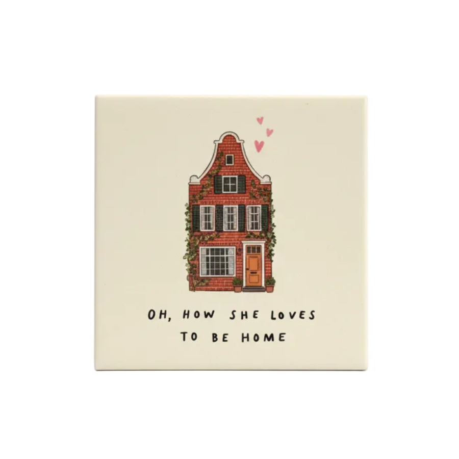 Voor de huismussen, de nestbouwers en iedereen die na een lange dag het liefst de sleutel in het slot steekt: dit tegeltje is voor jou. Met de liefdevolle tekst "Oh, how she loves to be home" en een charmante illustratie van een karakteristiek grachtenpandje, haal je direct een gevoel van rust en dankbaarheid in huis. De subtiele hartjes boven de schoorsteen maken dit ontwerp tot een hartverwarmende blikvanger in elke kamer.
