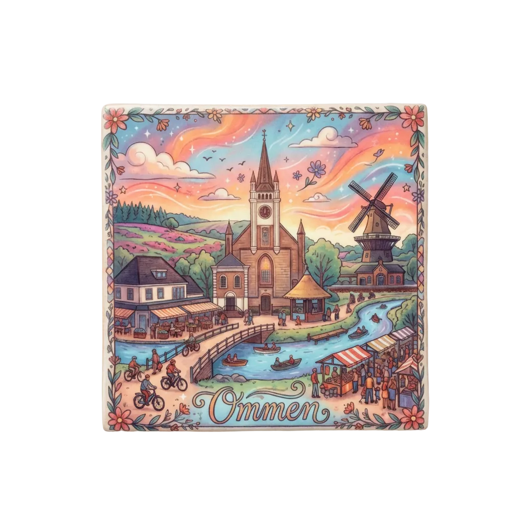 Of je nu een trotse inwoner bent, er graag op vakantie gaat of een bijzondere band hebt met deze veelzijdige stad: dit tegeltje van Ommen brengt de karakteristieke sfeer direct in je interieur. De gedetailleerde illustratie toont de meest iconische elementen van de stad, zoals de markante Hervormde Kerk, de historische molen en de gezelligheid van de Vecht met haar bootjes en bruggen. De vrolijke kleuren, de bloemenrand en de bedrijvigheid van fietsers en de markt maken dit ontwerp tot een prachtig eerbetoon aan de gastvrijheid van Ommen.