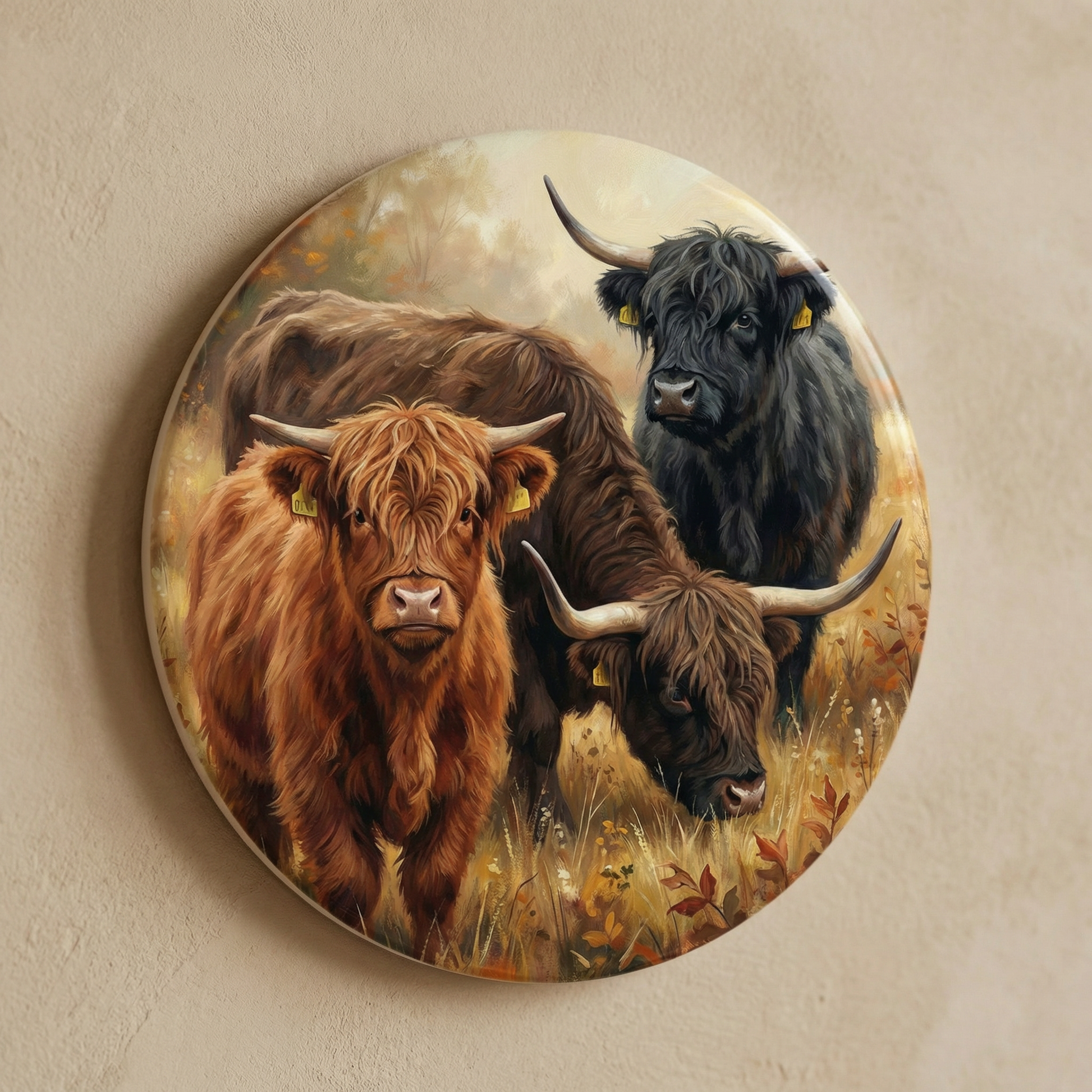 Breng robuuste schoonheid in huis met deze sfeervolle ronde tegel met Schotse hooglanders. Een icoon van de Schotse Hooglanden met hun karakteristieke lange vacht en imposante hoorns.