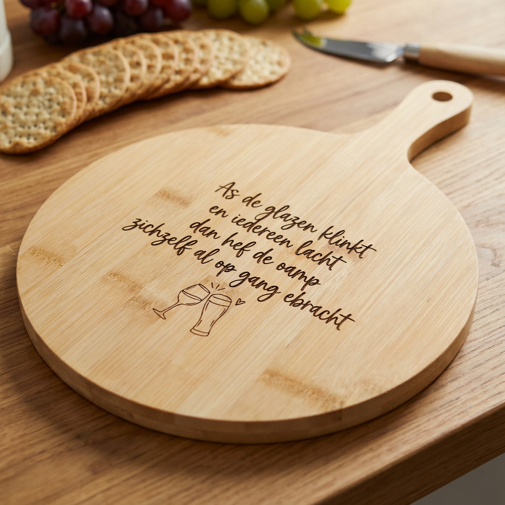 Deze robuuste houten borrelplank is voorzien van de prachtige Twentse tekst: "As de glazen klinkt en iedereen lacht, dan hef de oamp zichzelf al op gang ebracht". Een eerbetoon aan de gezelligheid en de nuchtere Twentse levensgenieter.