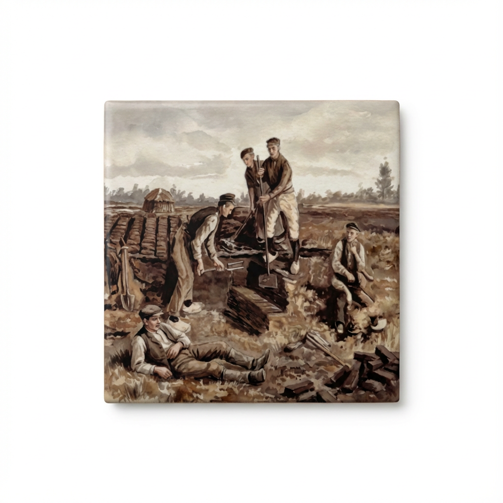 Historisch ontwerp: Een krachtige weergave van de veenarbeid in een klassieke, schilderachtige stijl.